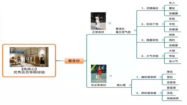 將進(jìn)入門(mén)店的客戶通過(guò)看身材分成結(jié)構(gòu)化兩大類(lèi),然后再通過(guò)和看五官、談吐、想瘦還是想胖再細(xì)分成六大類(lèi)型,然后在推薦相應(yīng)的服裝,讓客戶試穿后,有眼前一亮的感覺(jué),銷(xiāo)售自然大幅度提升了。