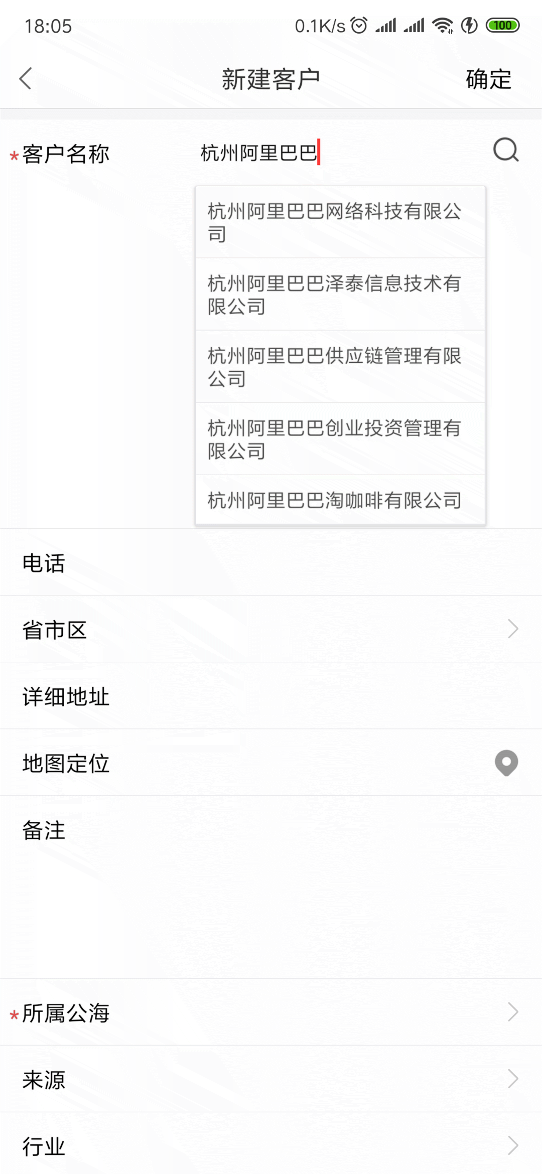 如輸入關(guān)鍵字“杭州阿里巴巴”后,系統(tǒng)將在下拉選項框中顯示抓取到的所有包含“杭州阿里巴巴”關(guān)鍵字的企業(yè)名稱,選擇相應(yīng)的企業(yè)名稱后,該企業(yè)的地址、注冊資本、法人等工商信息將全部呈現(xiàn)出來,銷售人員只需點(diǎn)擊“回填”,該企業(yè)的工商信息就能自動填充到系統(tǒng)中。此項功能將大大提高銷售線索/客戶信息創(chuàng)建的效率,并保證數(shù)據(jù)的準(zhǔn)確性,很好地解決銷售撞單、搶單等問題。