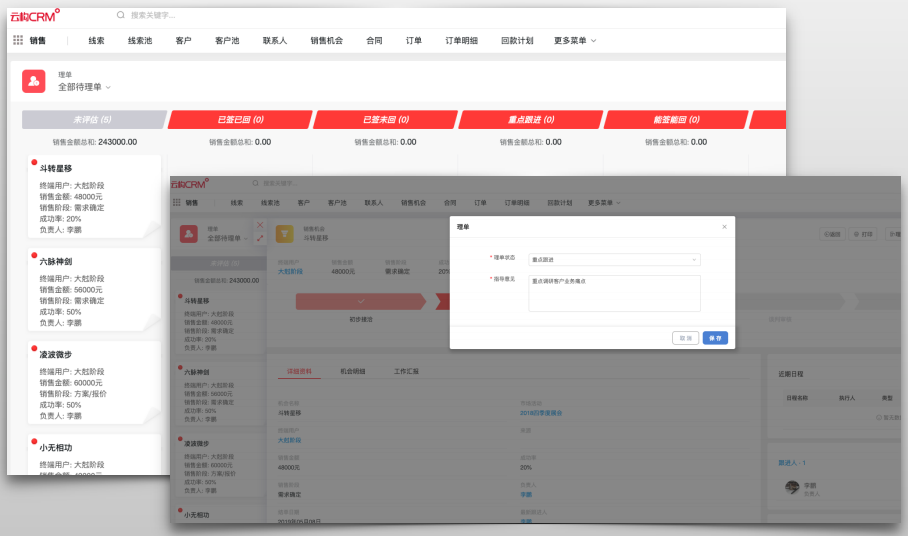 新版本在銷售機(jī)會階段推進(jìn)的過程中加?了“理單”環(huán)節(jié),提供了一個銷售管理者與?線銷售?員?對?評價指導(dǎo)的平臺,管理層可以為銷售?員提供針對性的?作指導(dǎo),提高銷售成功率,并能更加客觀和準(zhǔn)確地做出銷售預(yù)測。對于理單條件和理單階段等的自定義設(shè)置,企業(yè)同樣可以在后臺實現(xiàn)。