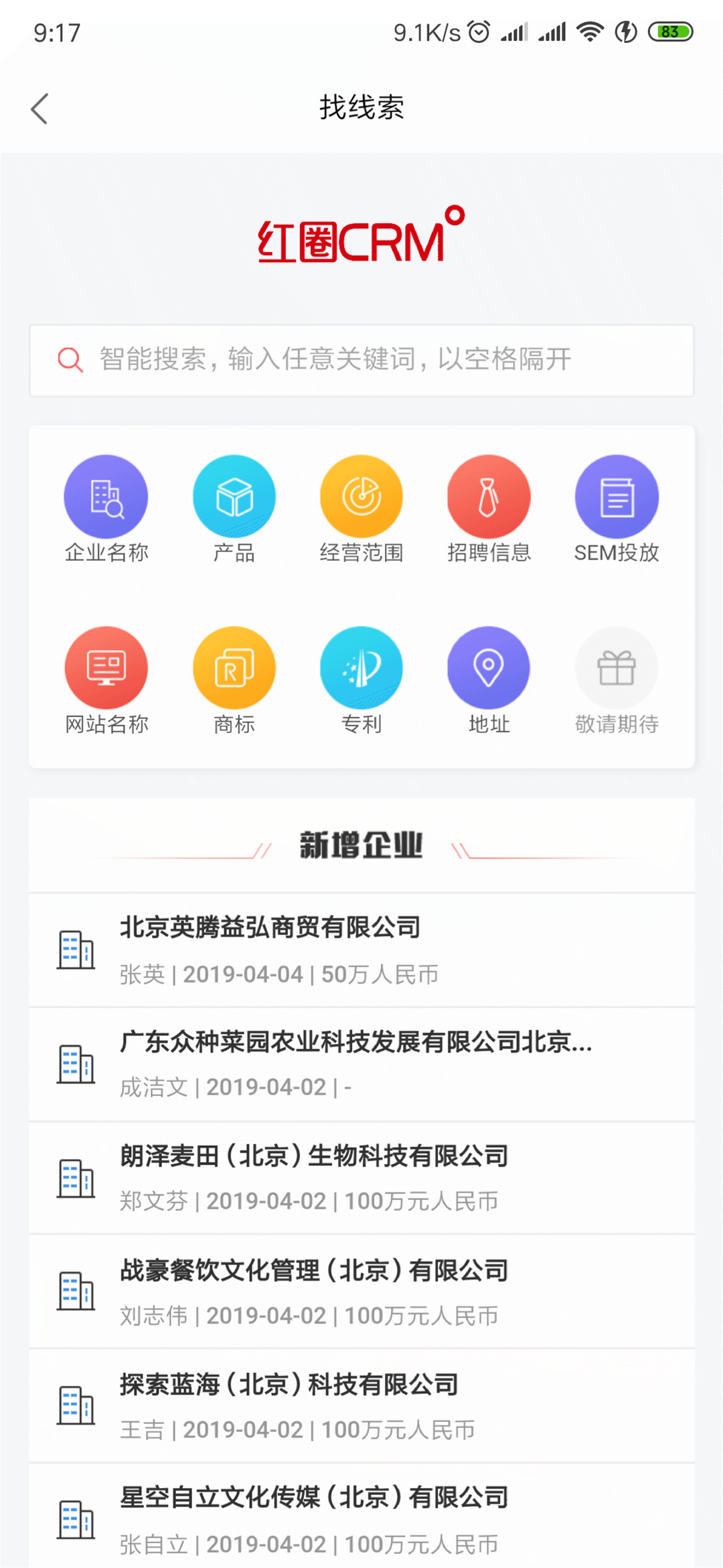紅圈CRM V1094版本將為企業(yè)解決獲客渠道單?、線索來源不穩(wěn)定的難題,從源頭出發(fā),助力企業(yè)業(yè)績提升。銷售人員在“找線索”頁面輸入關(guān)鍵詞(如企業(yè)名稱、產(chǎn)品、地址、招聘信息等)后,系統(tǒng)能夠基于全網(wǎng)大數(shù)據(jù)信息采集,從海量數(shù)據(jù)中精準(zhǔn)、快速地篩選出符合客戶畫像的優(yōu)質(zhì)資源,銷售人員能夠獲取企業(yè)完整信息以及相關(guān)聯(lián)系人、電話等精準(zhǔn)信息,并可?鍵轉(zhuǎn)為銷售線索,將重要信息保存到系統(tǒng)中。
