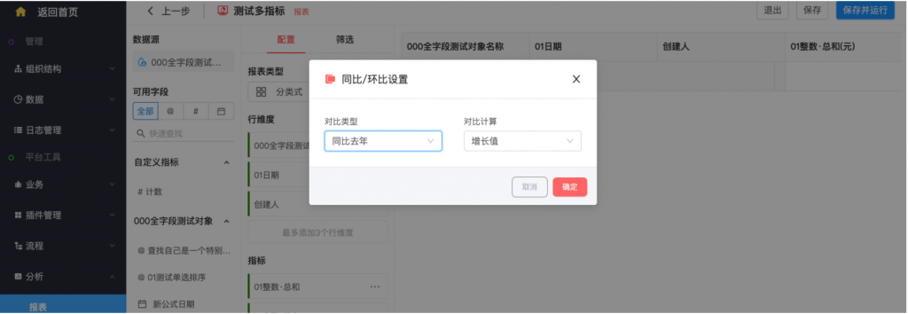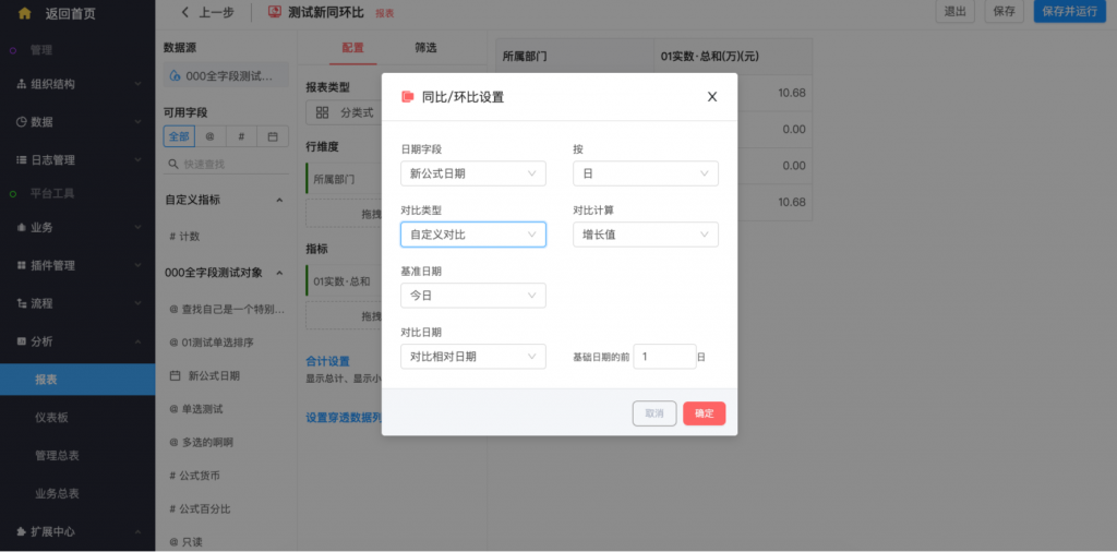 • 無時間維度的同環比設置,增加了自定義對比計算(相對日期和固定日期)