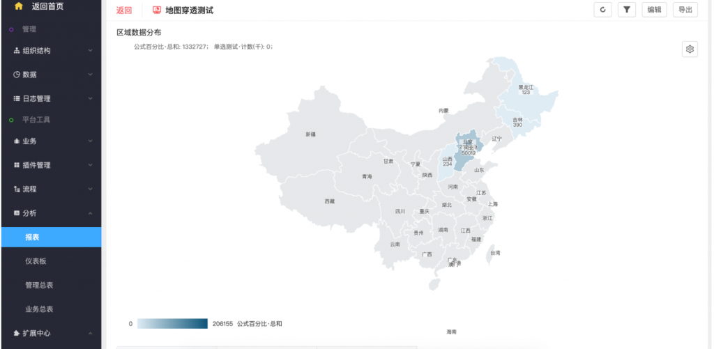 • 地圖可設置默認顯示區域,區域可進行向下鉆取,如點擊北京市,可查看北京各區的數據。每個區域的顏色代表數值的大小,顏色越深數值越大