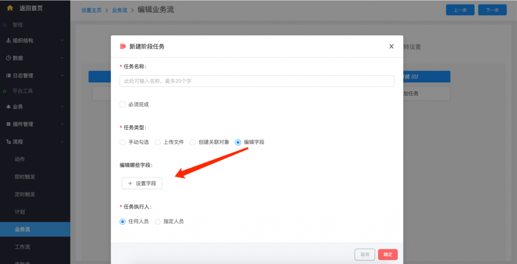 • 業務流添加階段任務,新增“編輯字段”類型任務,所有設置的字段均為必填
