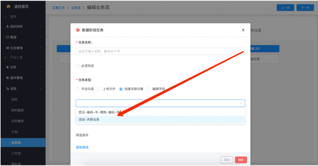 • 業務流創建關聯對象類型的任務,支持活動對象