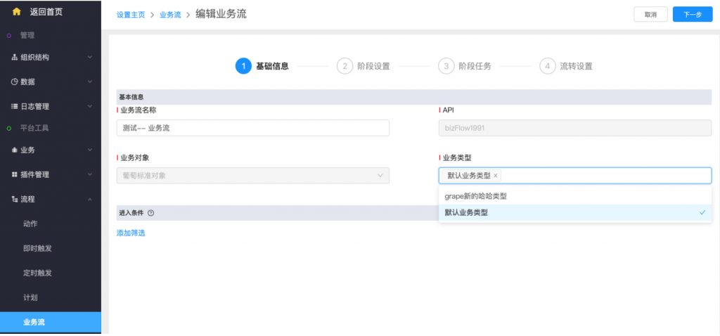 • 后臺編輯業務流配置時,支持編輯業務類型;