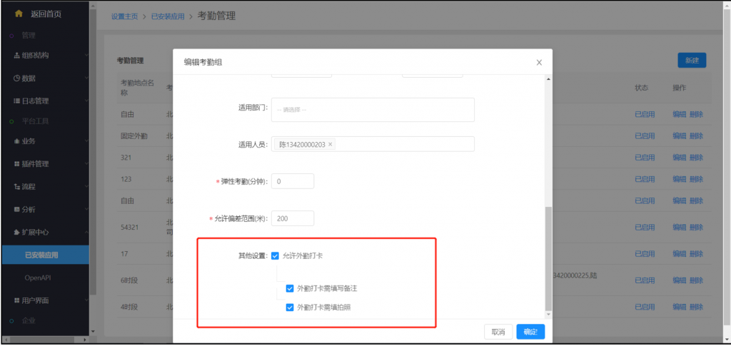 固定班制考勤設(shè)置,增加了是否允許外勤打卡設(shè)置(線上升級(jí)后默認(rèn)允許),并增加了外勤是否必須拍照或必須填寫備注