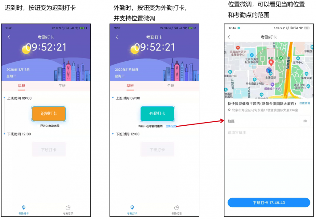 3)APP端考勤打卡頁(yè)面調(diào)整,支持位置微調(diào),遲到早退等異常打卡需填寫備注和拍照等