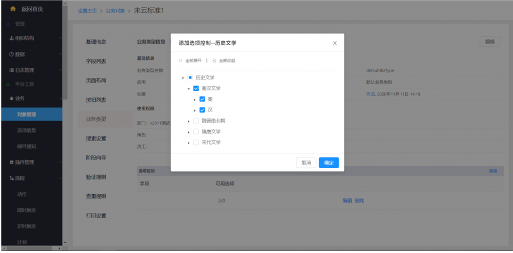 對象列表布局,設置二姐列表功能時,如果選擇的下游對象是本對象,則可以選擇按一節大列表顯示字段配置,也可以自己手動配置