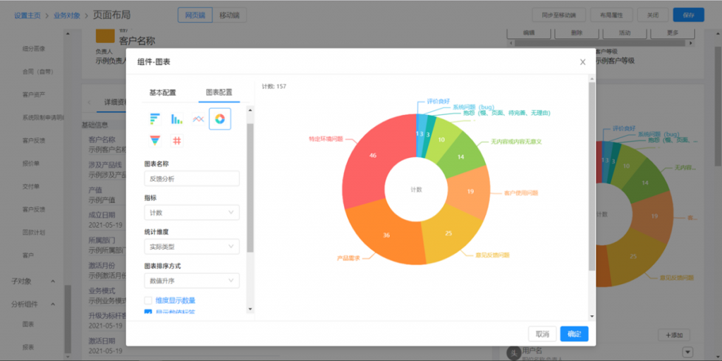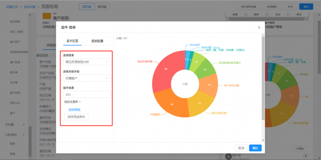 • 分析組件:選擇圖表和報表,拖入右側頁面區域進行配置