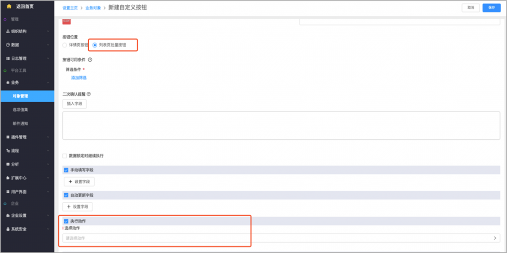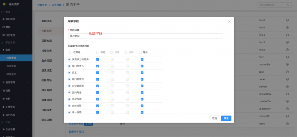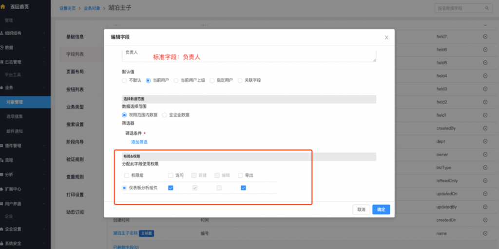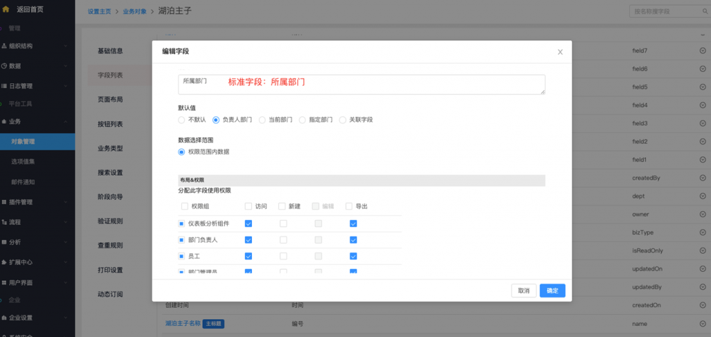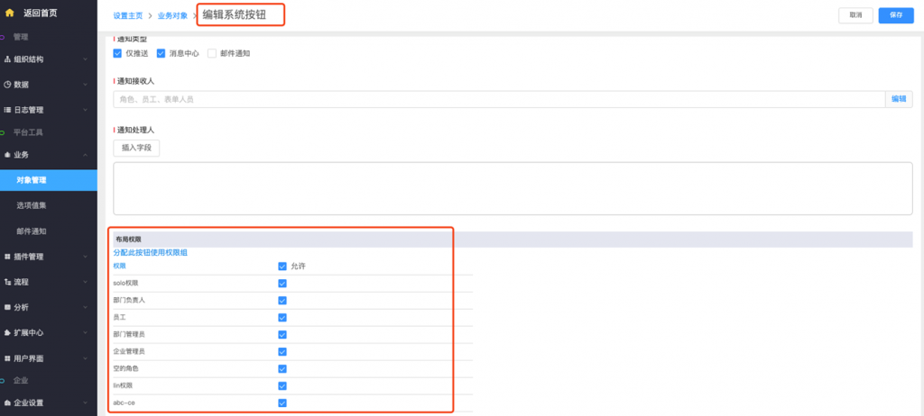 • 系統字段及按鈕修改權限配置:系統字段、標準字段(所屬部門及負責人)、按鈕支持在編輯時修改權限