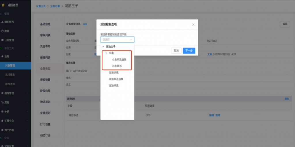 • 主對象業務類型控制子對象:主對象的業務類型可以控制子對象的單選及多選字段