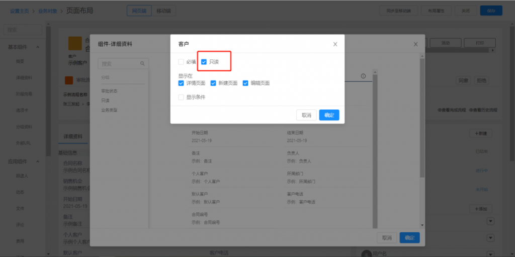 • 頁面布局字段可配置只讀:頁面布局-詳細資料組件中,字段可配置只讀屬性,在新建或編輯時,字段不可手動填寫,但默認值可正常計算