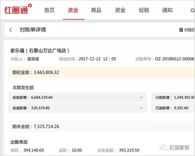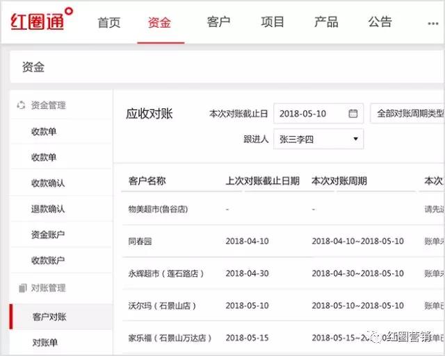 在6.5.3版本,紅圈后臺的資金功能中新增“客戶對賬”,為每個客戶設定對賬周期、定期生成對賬單。對賬單清晰呈現每個客戶在該對賬周期的應收、已收、期末應收金額以及發生金額明細,大大提高對賬效率。