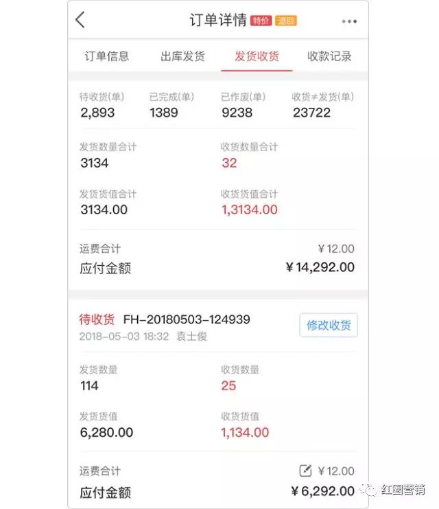 在出貨進貨中,由于運輸損耗等原因,企業發貨數量與客戶收貨數量不同的情況時有發生,為了便于處理類似的情況,紅圈通特別在訂單詳情頁增加發貨收貨記錄,支持分別記錄發貨收貨數量、單價、金額。