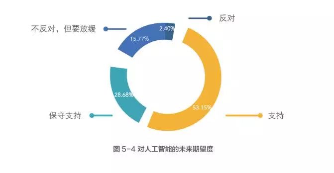 1)國民認知:國民對人工智能認知度高,超半數受訪者支持其全面發展。今日頭條的問卷調查顯示,只有6.23%的受訪者對人工智能不了解;53%受訪者支持人工智能全面發展,而持保守態度的為27%。