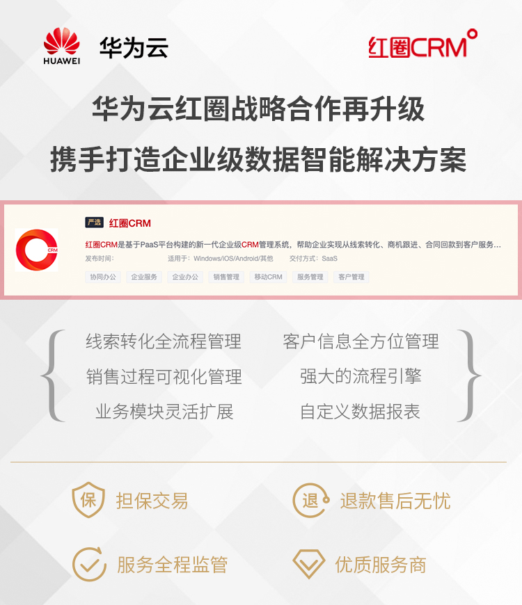 日前,繼2019年作為首批加入華為云WeLink的生態(tài)伙伴和唯一CRM系統(tǒng)服務(wù)商后,紅圈與華為云戰(zhàn)略合作持續(xù)升級(jí),再次在華為云嚴(yán)選商城發(fā)布了紅圈 CRM企業(yè)級(jí)移動(dòng)銷售自動(dòng)化管理系統(tǒng)。旨在基于華為云整體公有云解決方案的基礎(chǔ)上,為中大型企業(yè)、集團(tuán)公司用戶提供更加優(yōu)質(zhì)的數(shù)據(jù)智能解決方案,幫助企業(yè)實(shí)現(xiàn)從線索轉(zhuǎn)化、商機(jī)跟進(jìn)、合同回款到客戶服務(wù)的LTC全流程精細(xì)化管理,提升企業(yè)競(jìng)爭(zhēng)力,推動(dòng)企業(yè)業(yè)績(jī)?cè)鲩L(zhǎng)。