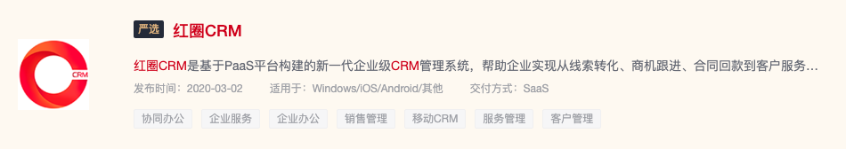紅圈CRM是基于紅圈獨(dú)立研發(fā)的PaaS平臺(tái)上構(gòu)建的企業(yè)級(jí)SaaS移動(dòng)銷售管理云服務(wù)系統(tǒng),具備高度的靈活擴(kuò)展能力,能夠幫助企業(yè)實(shí)現(xiàn)從線索轉(zhuǎn)化、商機(jī)跟進(jìn)到回款管理等LTC銷售全流程的精準(zhǔn)管理,有效支撐企業(yè)復(fù)雜的業(yè)務(wù)場(chǎng)景需求及業(yè)務(wù)變化。通過(guò)面向客戶業(yè)務(wù)的數(shù)字化升級(jí)需求場(chǎng)景構(gòu)筑了在移動(dòng)辦公、溝通協(xié)作、銷售與營(yíng)銷等業(yè)務(wù)場(chǎng)景解決方案,幫助企業(yè)實(shí)現(xiàn)了高效的團(tuán)隊(duì)協(xié)作,大幅提升了組織效能,更加全面地推進(jìn)了業(yè)務(wù)進(jìn)步。