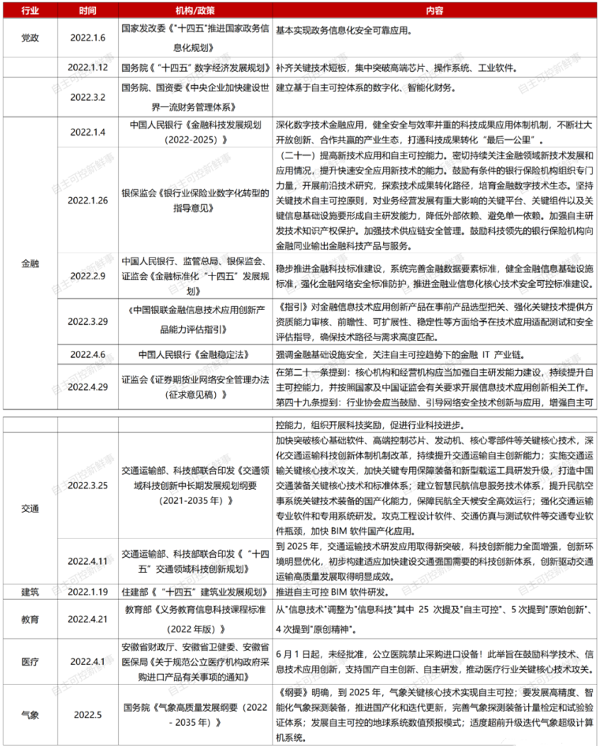 據不完全統計,截至2022年6月13日,國家頂層設計層面共出臺信創相關政策14份。分行業來看,金融6份、交通2份、建筑1份、教育1份、醫療1份(安徽?。庀?份。