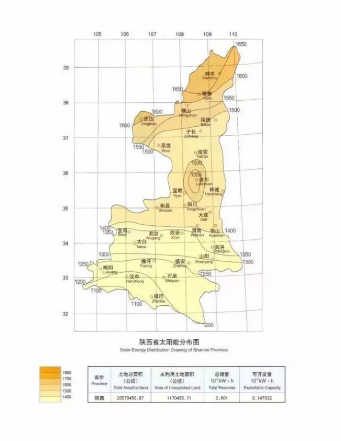 陜西省具有豐富的太陽能資源,太陽能資源空間分布特征是北部多于南部,全省太陽能年總輻射量在4410~5400MJ/m2之間。初步推算,陜西的太陽能資源經(jīng)濟(jì)技術(shù)可開發(fā)量大約1.1億千瓦。