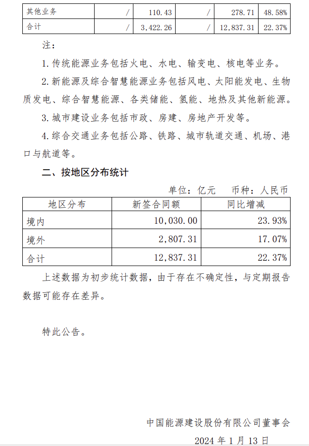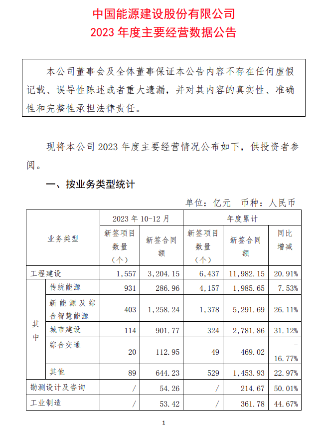 新簽合同額12837.31億!中國(guó)能建發(fā)布2023年度主要經(jīng)營(yíng)數(shù)據(jù)情況