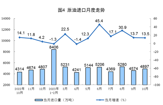 1—10月份,生產原油17405萬噸,同比增長1.7%。進口原油47322萬噸,同比增長14.4%。
