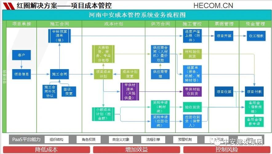 在集團公司領(lǐng)導班子的指導下,成本管理中心制定了詳細的工作方案,設計了60余張成本數(shù)據(jù)表格。而紅圈專業(yè)實施老師也進行了兩次系統(tǒng)調(diào)研,用兩周時間將60余張報表拆解合并成30余個業(yè)務管控點,并結(jié)合管控業(yè)務流程圖進行功能匹配,設計了《中安集團成本管控系統(tǒng)實施計劃表》,涵蓋了往來單位管理、施工合同管理、成本核算管理、成本合同管理、成本結(jié)算管理、項目資金收支管理等項目核心業(yè)務,并且細化了成本管理流程中各個系統(tǒng)責任人的工作職責。