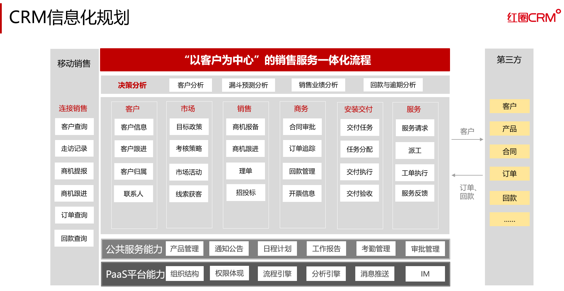 售后服務等業務環節都可能會有產品設計與工藝方案的調整,企業的業務模式具有明顯的多元化、個性化和碎片化特征,制造業企業必然面臨商業模式和管理模式雙重挑戰。為打通與改善企業從市場營銷、銷售、研發、采購、制造到客戶服務等核心業務環節,借助紅圈CRM打造統一客戶交互平臺,提升管理質效,為客戶創造更大的價值。